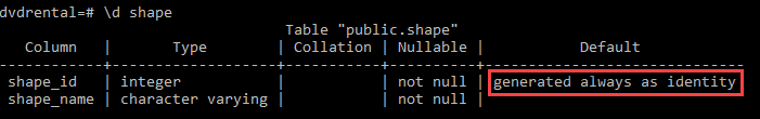 As you can see from the output, the shape_id column changed from GENERATED ALWAYS to GENERATED BY DEFAULT.